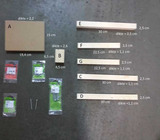 - Vuren geschaafd 27 x 44 x 270 mm -> onderdeel B (2 stuks)