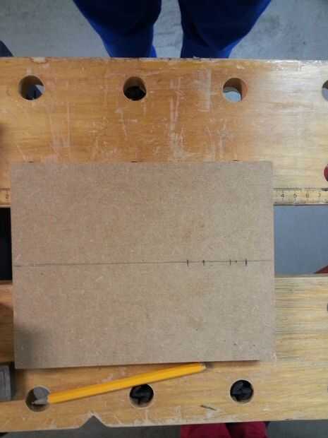 Bij este stap beginnen conocimos de onderkant van de houder. Hierbij hebben wij onderdeel una puja en B. TEKEN op onderdeel un lijn een en het midden. OP 2,5 cm van de kant zet je onderdeel B en het midden op de lijn. TEKEN streepjes twee om de maat ba-a te zien op onderdeel un (afbeelding zie). Tussen deze lijnen twee maak je twee gaatjes en het midden.