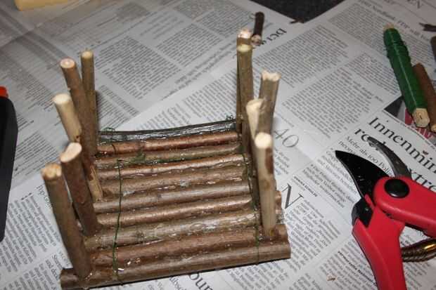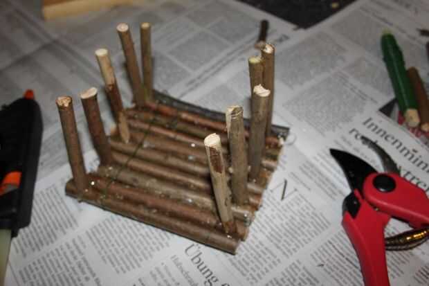 Ahora pegué las ramitas de 5 pulgadas de altura hacia arriba en tres lados. Hay que no específico sistema regla pegar, tan de largo todas las ramitas en una altura. Hay cuatro fotos de la que se puede entender bien.