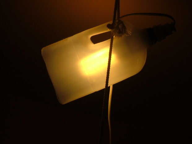 Sostener, colgar o sujetar por la empuñadura de la botella. Cuelgue el apoyo para hacer más fácil ajustar el ángulo de la flexión. La forma no es un reflector muy eficiente, pero puede mejorarse un poco por lo forro con papel de aluminio.