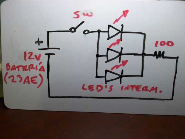 Soldar el LED, la resistencia y el interruptor. Poner 3 LEDs en paralelo, teniendo en cuenta la polaridad de los diodos emisores de luz se colocan. Normalmente el terminal más largo es positivo (o ánodo) del dispositivo.