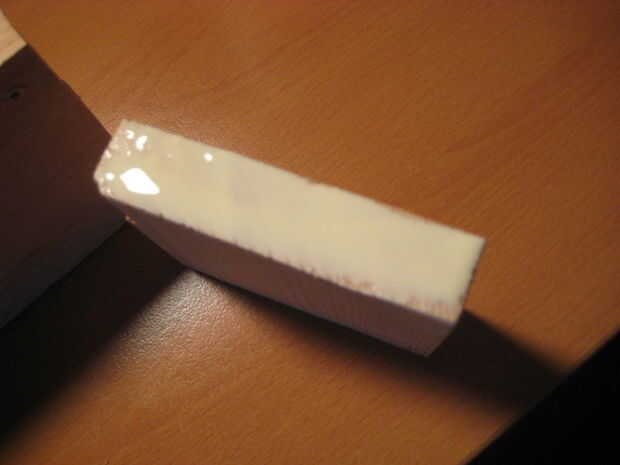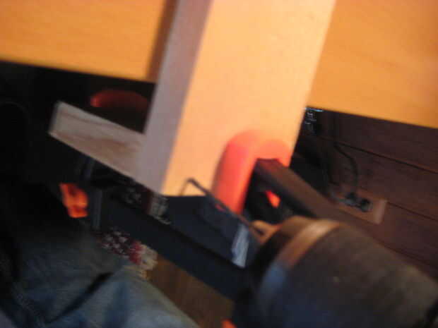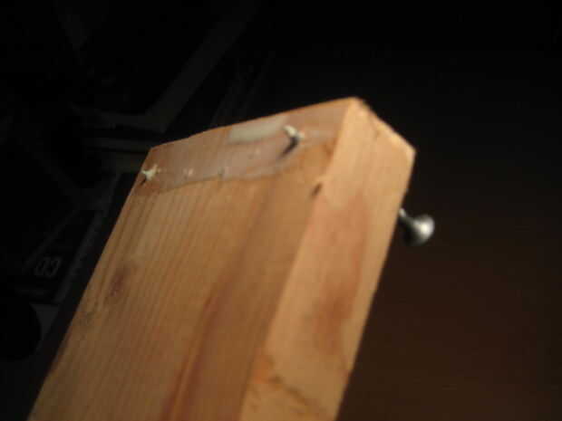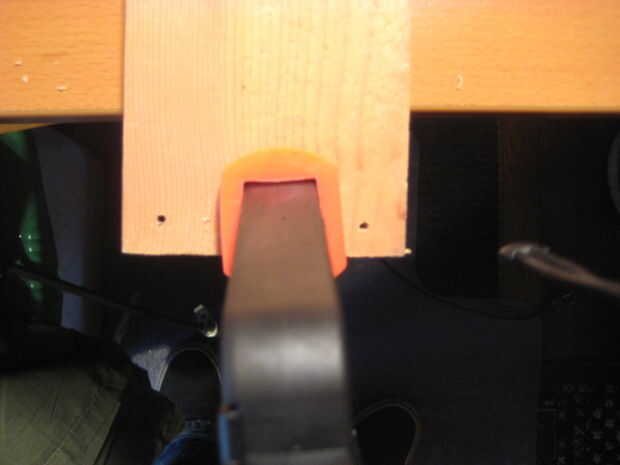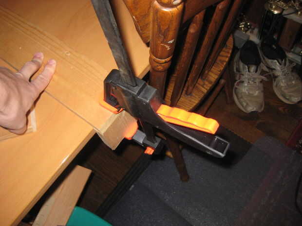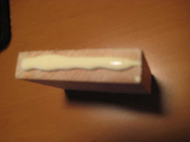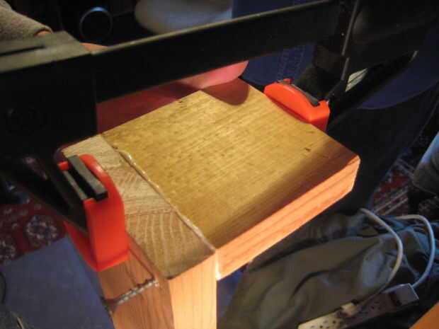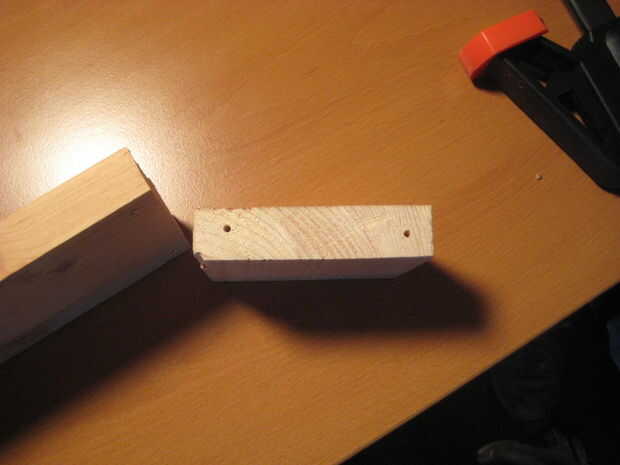 Suelte las abrazaderas (haga una marca pequeña en ambos bloques para que sepas qué lados se corresponden con cada uno otro, a facilitar la les reconexión) y poner algún pegamento para madera en el extremo perforado del bloque más pequeño y luego alíselo en hacia fuera con el dedo.
