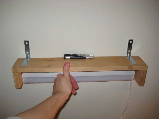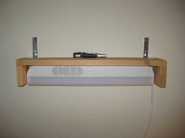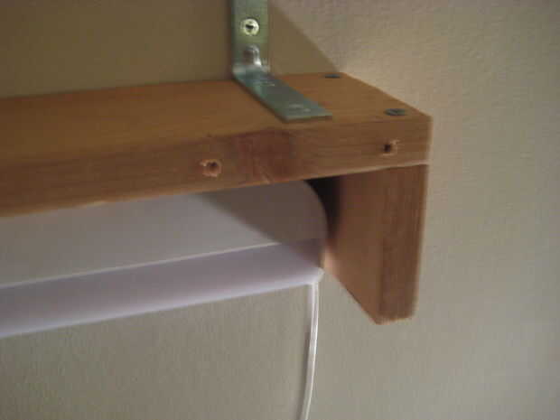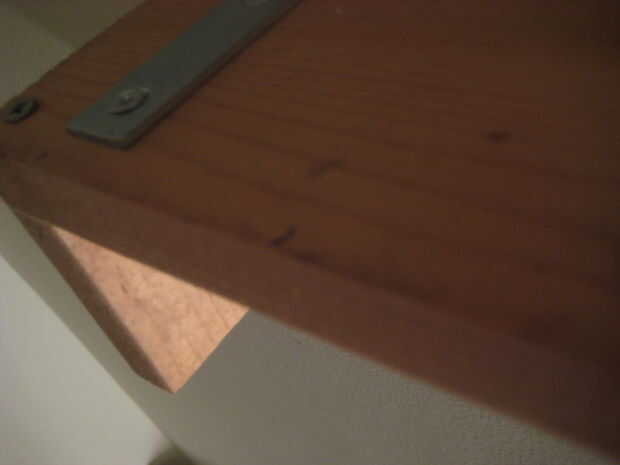 Cuatro tornillos #8 x 5/8" en los soportes en L y en la pared asegurándose de no apretar en exceso. Taladre los orificios de arriba primero en ambos lados y luego los dos inferiores. Brevemente maravillarse con su montaje nivelado hacia fuera.