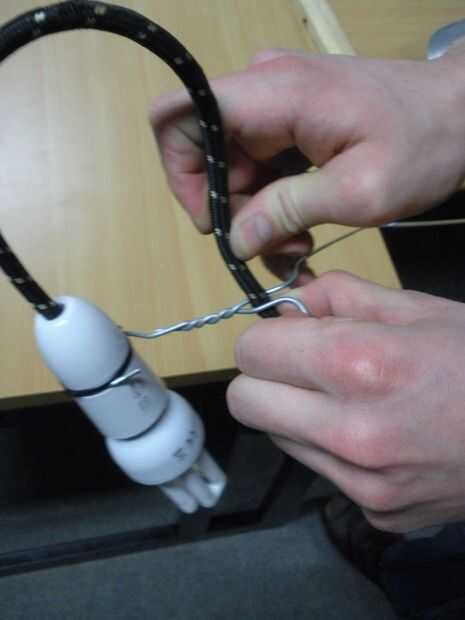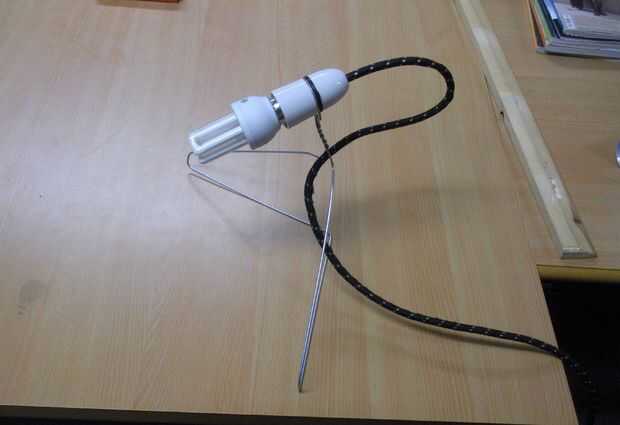Quitar la parte superior del portalámparas (la parte con forma de cúpula) y empuje el hilo por el gancho de la percha y vuelva a colocar la parte superior. Formar un bucle en el cable detrás de la titular y prensa en la ranura en el soporte por debajo de la torcedura. Colocar la bombilla, coloque la lámpara sobre la mesa y ajuste la curva debajo de la torsión hasta que está parado en su propia