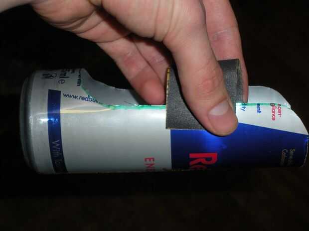 Limpia hasta el borde de la lata con el papel seco y húmedo, usted conseguirá un mejor resultado si el papel está húmedo pero no empapado. Asegúrese de elimine las rebabas (brocas afiladas, puntiagudas), el mejor método es paralelo al borde del metal de la arena y ligeramente arena alrededor de cada lado del borde en un ángulo de 45 grados. Deje la lata seca completamente antes de intentar el paso 11, si no te gusta vivir peligrosamente por supuesto, prefiero mantener el agua alejada de electricidad, realmente duele cuando va mal!