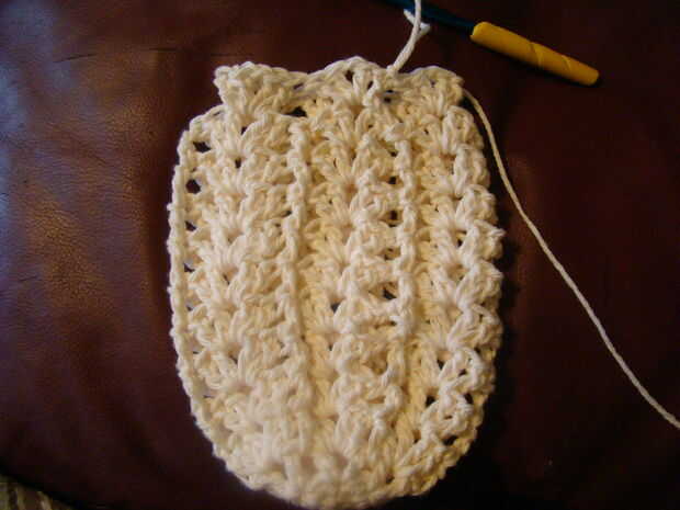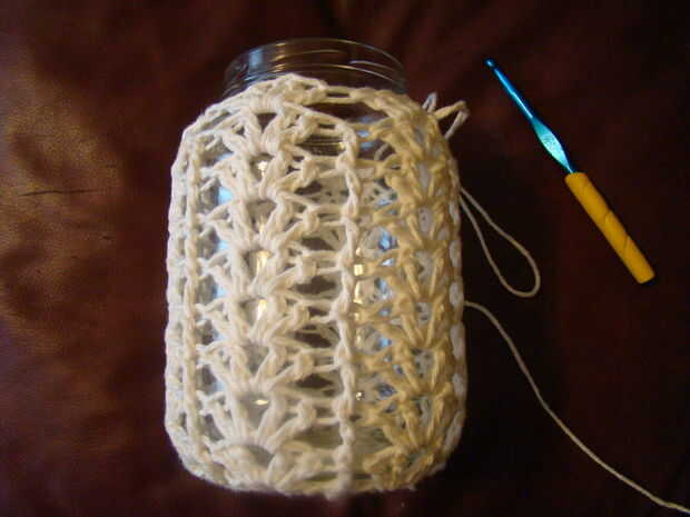R 12 – sl st en la parte superior del siguiente inicio 2 º en el centro de la V vuelta CC, CC, ch, 2dc, saltar el siguiente dc, * (en el centro de la V siguiente, 2dc, ch, 2dc, sáltese el siguiente dc,) repetir desde * 4 veces más, sl st en la parte superior de la primera puntada de la ronda (30 st) Esto reduce el tamaño del cordón para ajuste más apretado alrededor del cuello de la jarra.