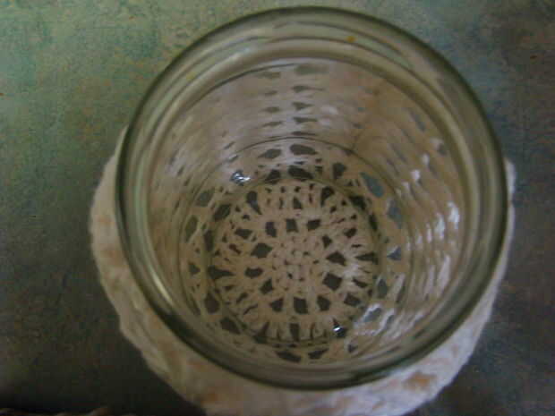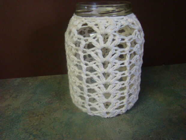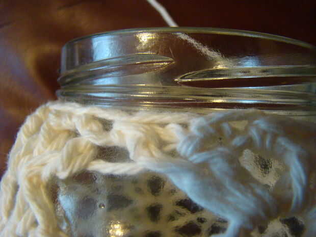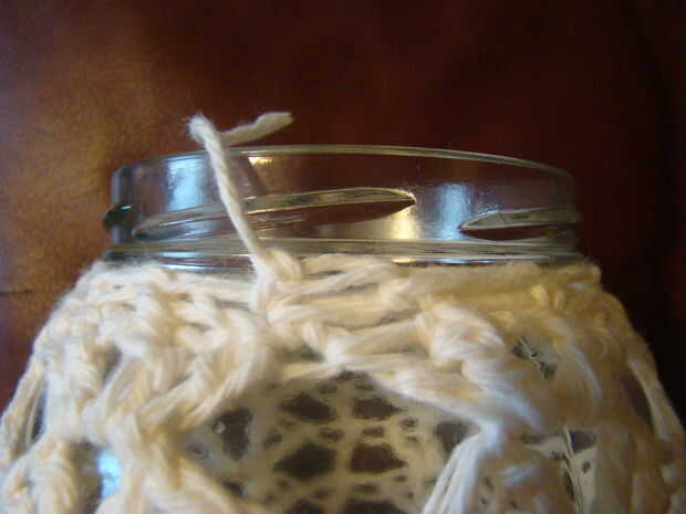 R 13-* sc 2 juntos, sc, repetir desde * hasta llegar completamente alrededor del frasco.
