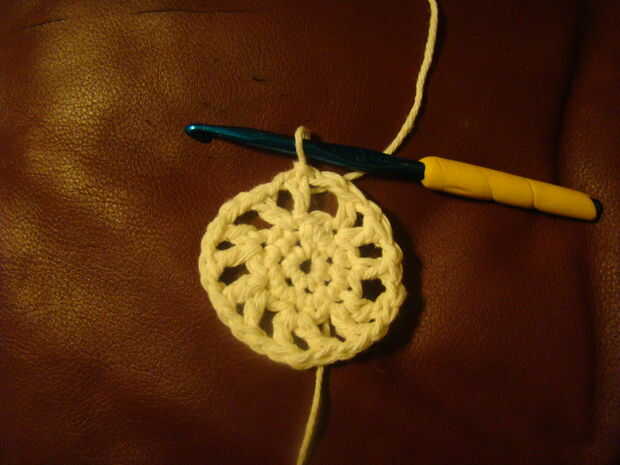 R 2 – en el mismo espacio donde hiciste la sl st 1 vuelta CC, ch, CC, ch, saltar la puntada siguiente, * (1dc, 1dc, ch, ch, ch salto siguiente st), repita desde * 4 veces más, sl st en la parte superior de la primera puntada de la ronda (12 st)