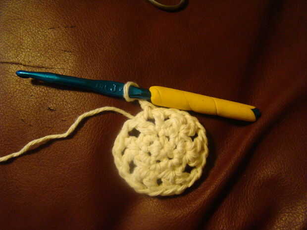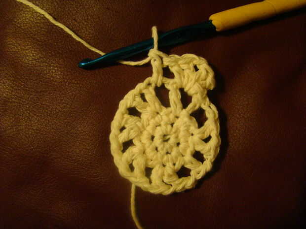 R 3 – sl st en la parte superior de la siguiente st comienza en el centro de la V, dc vuelta, ch, 2dc, dc, dc en el espacio creado por la ch entre 2 V, * (en el centro de la próxima V 2dc, ch, 2dc, dc en el espacio creado por la ch entre las 2 de la V, repetir desde * 4 veces más , sl st en la parte superior de la primera puntada de la ronda (36 st)