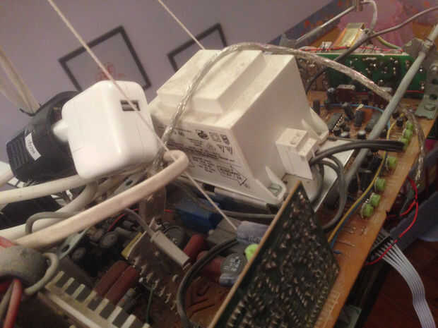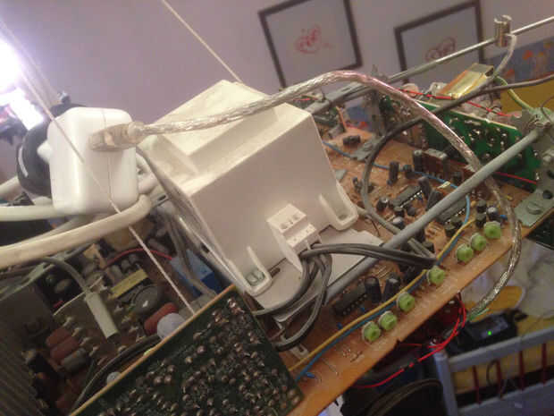 La fuente de alimentación para el Arduino es a través de la línea de corriente alterna V 220, un enchufe, una vieja fuente de alimentación de iPhone con un conector USB. En lugar de la batería estándar cortar un cable USB viejo y soldar su poder y tierra líneas en el Arduino. Así actualmente el parpadeo sólo pasa, mientras que la luz está encendida. Pero con la fuente de alimentación a través del USB supongo que podría enlazar un banco de potencia para actuar como una batería, tal que los LEDs pueden parpadear durante todo el día.