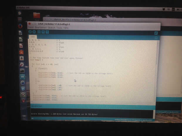 Yo jugaba con algunos patrones de parpadeo y terminó con el código morse para nombre de mi hija (la de la lámpara en su habitación) una vez cada cuarto de hora. Obvoiusly, el Arduino podría hacer cosas mucho más complicadas, pero para empezar, estoy bastante contento con el efecto.