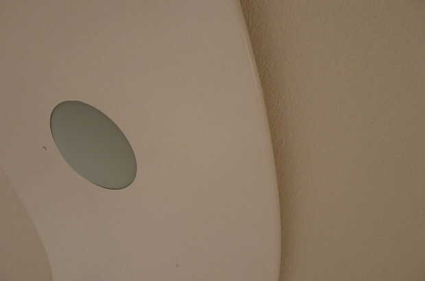 La lámpara es en forma de un anillo, que se extiende de pared a pared. En este caso, la luz rodea un tragaluz. El anillo sí mismo añade propiedades de diseño para la construcción: