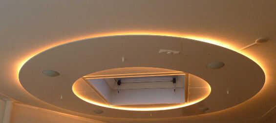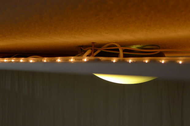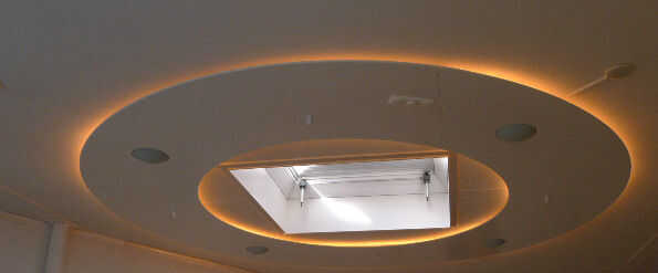Cuatro vigas entonces se unen a las placas, dejando espacio en los bordes a integrar las lámparas para la funcionalidad de la iluminación normal. En hacer pedido que las placas muy bien montar un pequeño listón cubre las juntas en la boca. Las cuatro vigas tienen dos funciones: mantener una distancia del techo (44 x 44 mm o 1.73 x 1.73 en vigas fueron utilizados en este diseño) y la distribución de fuerzas a lo largo de las placas. La distancia es necesaria para lograr el efecto de luz indirecta hacia el techo, pero también resulta útil cuando los bulbos necesitan reemplazarse: permite acceder a las luces de arriba.