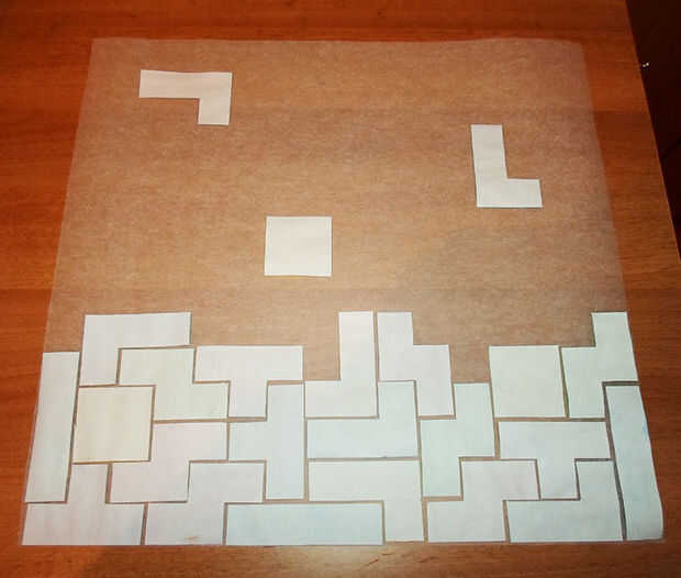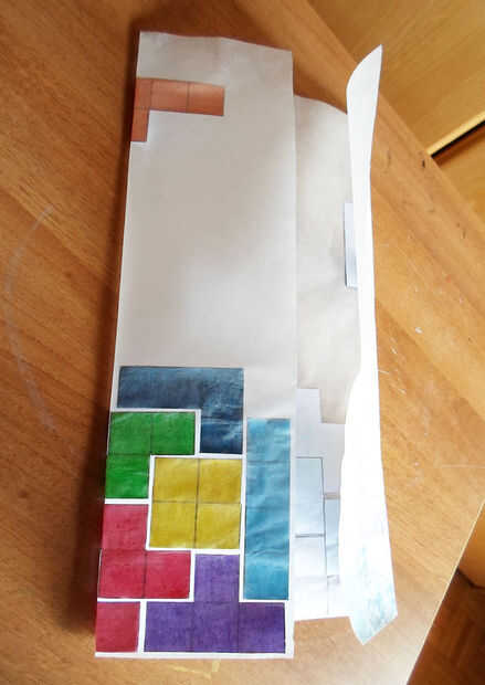 Una vez que su papel de panadería, coloque las piezas de Tetris en ella y pegar, como se puede ver en la imagen.