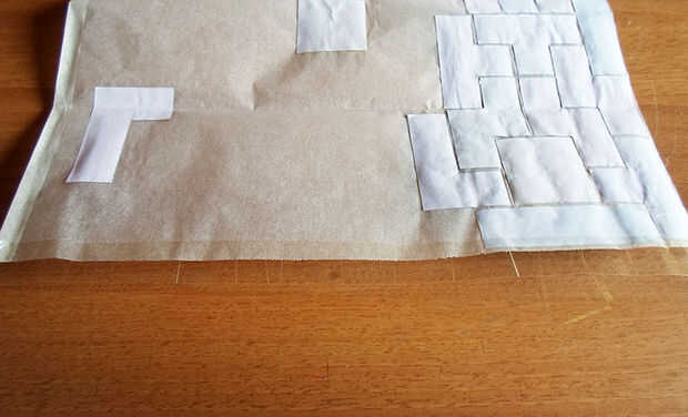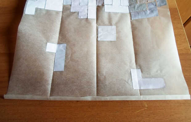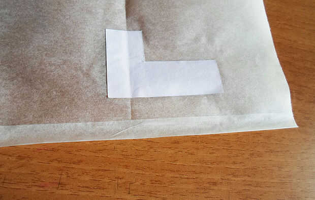 Adhiera un pedazo de cinta adhesiva a uno de los bordes cortos: Asegúrese de que está en el interior del papel de panadería y dejo algunos de la cinta para el otro borde (ver imagen).