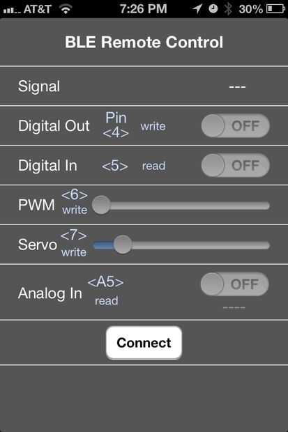 Redbearlab.com provee una aplicación en app store de iTunes llamada "BLE Arduino". Con esto, usted puede controlar manualmente el servo si quiere. Es muy fácil:
