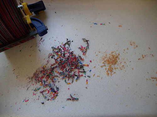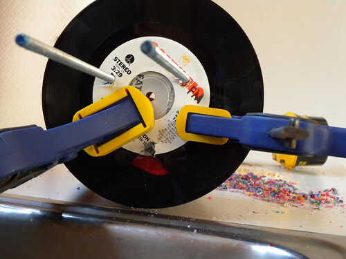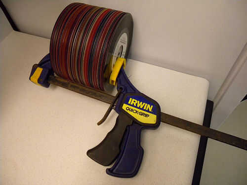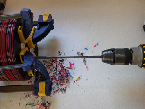 Luego perforé a través de la pila con una broca extra larga que era sólo un poco más grande que la varilla roscada. La razón de que esto es el primer paso es porque tarda mucho tiempo. La broca se calienta y comienza a fundir el vinilo. Creo que un promedio de cerca de un cuarto de pulgada cada vez. Luego dejaría el pedacito fresco mientras trabajaba en la base o la luz.
