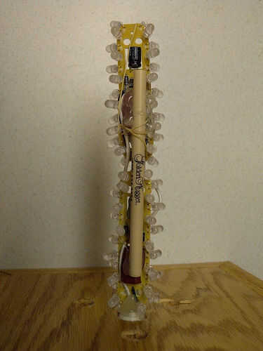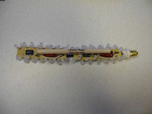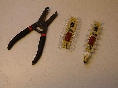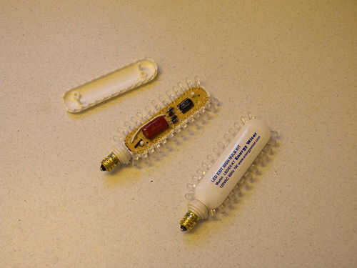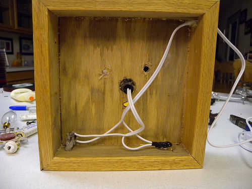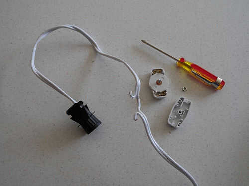 Compré unos conmutado tomas de luz y enchufes. He usado un botón con un botón de acero inoxidable de un estereo viejo que desmonté. Y para las luces de mi querido la lámpara para ser energéticamente eficientes usé estas luces de LED utilizadas para las luces de salida de emergencia. (Búsqueda de "salida de emergencia LED retrofit" debe dar algunos resultados. Compras - los precios varían mucho) Calculo que esta luz me costará unos pocos centavos al día si lo dejé en 24 horas. Porque sabía que mi lámpara sería más alto que una (y porque sopló la bombilla fluorescente que probé primero) me rompí los apart (también es necesario para caber dentro de los 45 años) y soldar dos en serie. He utilizado parte de un lápiz para unir las dos luces.