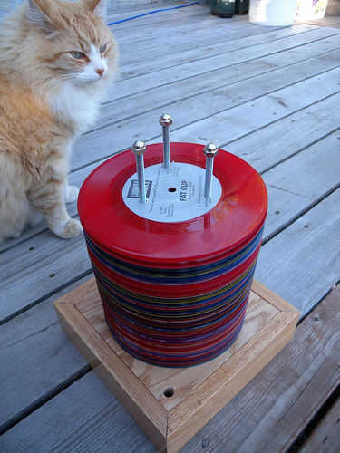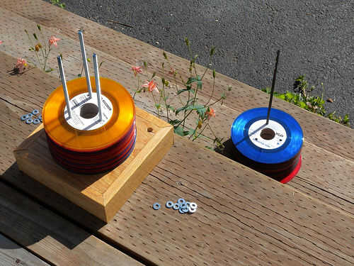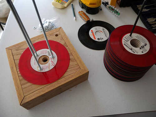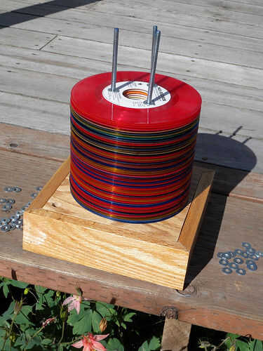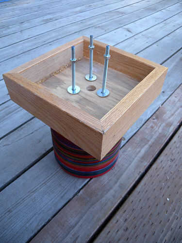 Ahora mover una varilla roscada de la pila a la base. interruptor de la tuerca una arandela guardabarros y una tuerca hexagonal. Poner la broca en el agujero vacío. Remueva las otras dos varillas roscadas y ponerlos en la base. mantener la pila de registros orientados a tomar uno y tirón encima y sobre las varillas. Poner las arandelas en las varillas y luego tomar un siguiente y voltea antes de ponerlo. Seguir haciendo hasta que esté fuera de los registros, usted está lo suficientemente alto para su bombilla o te gusta el aspecto de la misma.