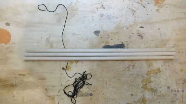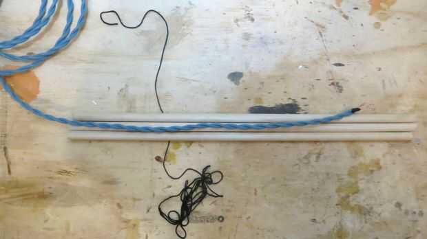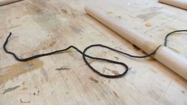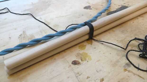 Ahora que el cable está saturado, tire hacia abajo en la ranura que hecho antes, dejando unos 8" holgura en el lado izquierdo y el resto a la derecha. A continuación, rodar la espiga y coloque los dos tacos restantes junto a él. Agarra el cable eléctrico y colóquelo en algún lugar en la parte superior / entre los tacos. Ahora Envuelva el extremo largo del cable todo el manojo de espigas, cordón de 4 - 5 veces. Alinee el cable como se envuelve, pero mantenerlo en sobre una tirantez media por ahora...