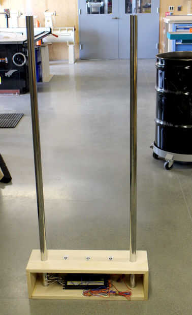 Los polos del cromo fueron insertados en la caja, el soporte de la bombilla de clavija de madera en fue colocado encima de la caja de madera para determinar la altura serían los polos de cromo. Yo dejando un margen de error, socava los polos. Cortes pequeños, incrementales se podían entonces hacer más adelante para acortar los montantes de cromo a la longitud correcta. El recorte de uno de los cortes fue utilizado como el travesaño horizontal que más adelante tendrá la luz de conexión de los miembros horizontales y verticales se representan algunas de las medidas. Por ahora, dejaremos los polos de cromo ya que hasta que refinamos los codos.