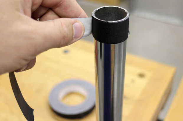 Después de que el cromo corte a la longitud que podemos centramos en los puntos de conexión entre el 1-5/16" cromo barra del armario y el 1-1/4" J-bend, una diferencia de 0,06". Usé unos vientos de cinta de tela adhesiva para construir el tubo cromado y encaja perfectamente dentro de la curva J. La cinta fue ocultada dentro de la curva J, y cualquier cinta expuesta fue fácilmente cortado con una navaja afilada.