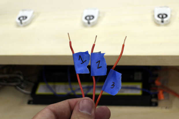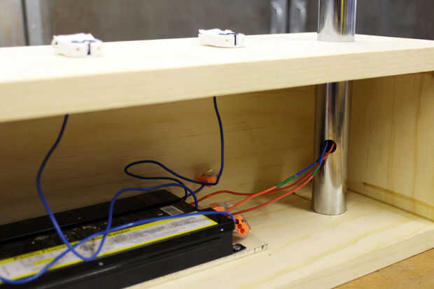 Con los cables cortos de lastre ya instalados en la parte superior de la caja de los conectores de alambre alargado fueron etiquetados a los balastros correspondientes. Estos cables se rosca a través de una pequeña abertura creada cerca de la base de una de las barras de cromo que se oculta dentro de la caja.