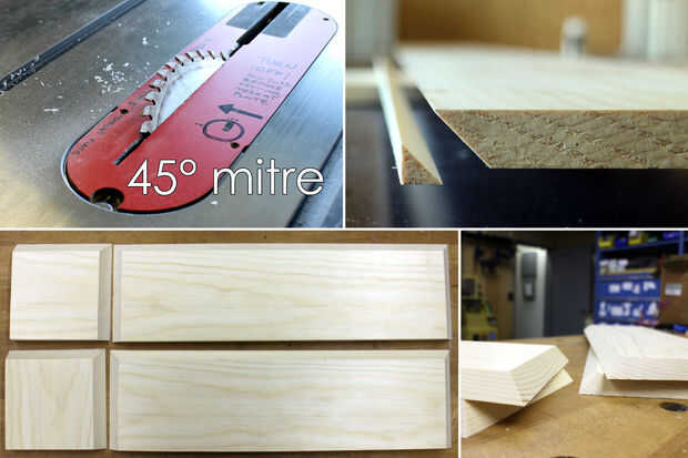 Comencé cortando al hilo de las tablas a 7" ancho, recortar los bordes. La Sierra de mesa se estableció en 45° y un tablero fue arrancado para tener un bisel en un lado. A continuación, la Junta de inglete fue picada en trozos; dos pedazos más largos para la parte superior y frontal de la caja y dos piezas más cortas para el cuadro termina. Luego fue inglete los extremos de cada tabla cortada.