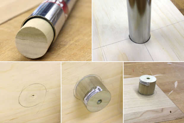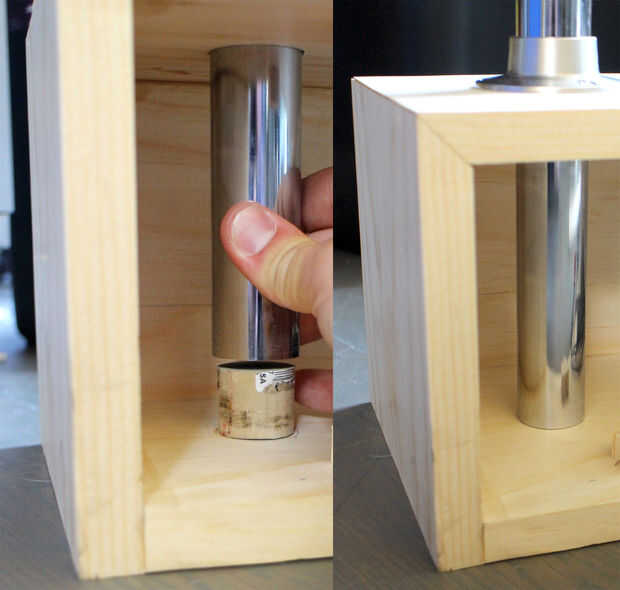 Los polos fueron insertados dentro de la caja y se trazó un esquema donde terminaron en la pieza inferior de madera dentro de la caja. A continuación, fue quitado el Polo 1" secciones de madera espiga se cortaron e instaladas donde se trazó el polo.