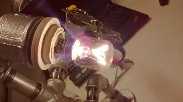 después se inspira en instructables otros como ver algunas lámparas de muy costosa tubería en ETSY... Decidí hacer mi propia.Tomé una lámpara de IKEA JANSJO y cortar la base y el vástago a través del tubo de rosca. Yo entonces calor envuelto mi traba