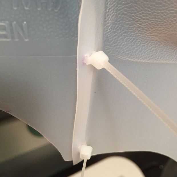 Cortar la parte superior de las botellas por encima de la manija y unirlos con ataduras de cremallera como se muestra en las imágenes
