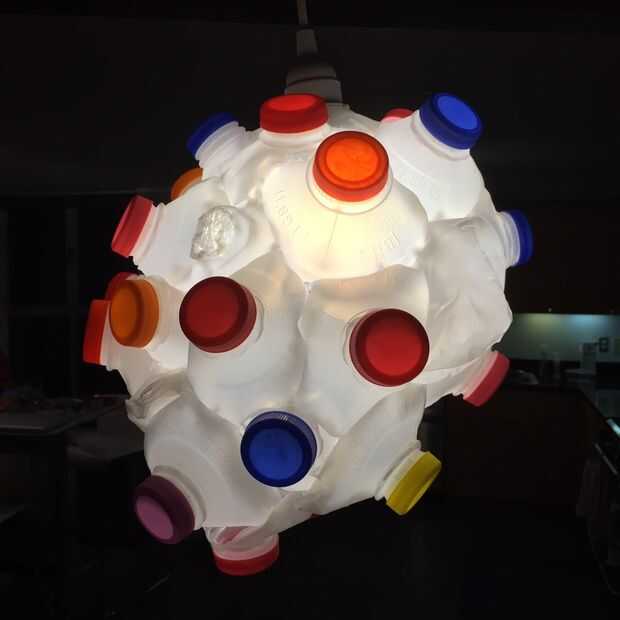 Hacer una lámpara con estilo con materiales cotidianos de bajo costo.Paso 1: Obtener botellas de polietileno de alta densidadReunir al menos 20 botellas de leche o jugo HDPEPaso 2: Botellas de polietileno de alta densidad lavadoLave botellas de leche