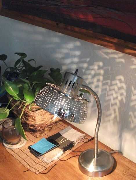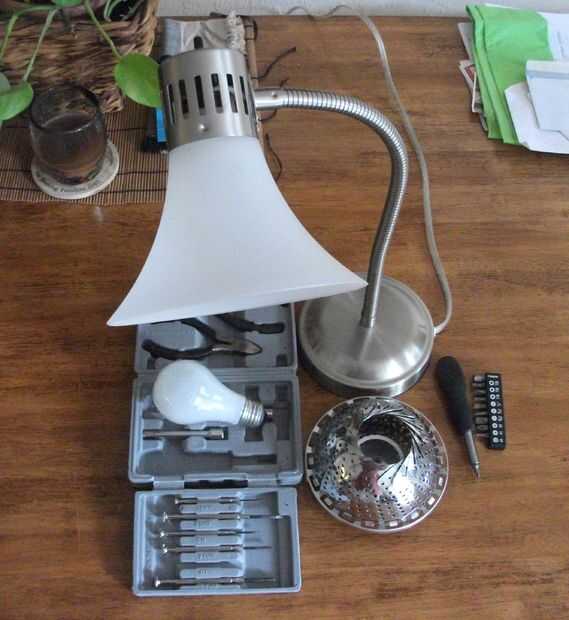 Primero vi una lámpara como esta en un reciclaje de sitio web recyclart.org y pensé que sería un proyecto fresco. Sólo tomó unos 30 minutos... no se necesita de cableado, por lo menos no en este caso... sólo asegúrese de desenchufar la lámpara. Esta lámpara de escritorio particular era de Ikea... no estoy seguro del nombre del modelo, fue comprado hace algunos años. El vapor vegetal provenientes de la tienda de dólar.