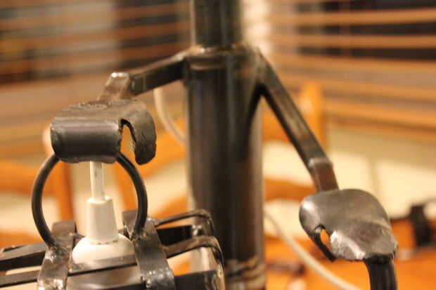 Primero me quedé con el cuello y la cabeza. El cuello es laminado de acero de calibre 14 para tener un diámetro de aproximadamente 1 1/4" y está soldado a la parte superior del tubo con capa. En la parte superior del cuello es un diámetro de 2 1/2" en calibre 14 de la cabeza con dos 14 calibrador extremos. Una vez que los dos extremos se sueldan a la cabeza uno de los extremos fue soldada con autógena al cuello. Después el cuello y la cabeza los brazos vinieron siguiente. Los brazos están hechos de tubo cuadrado 1/4 "x 1/4". El tubo debe ser cortado en 4 partes iguales y un ángulo a los ángulos deseados. Las manos eran de corte de 14 calibrador de acero con un pulgar y hecho para parecer más como guantes. Después de la caña y la linterna se hicieron las manos estaban decididas para formar a ellos. Ahora se hacen las manos y brazos. Calienta el 1/2" de diámetro redondo de la placa para formar la caña y soldada a la mano.
