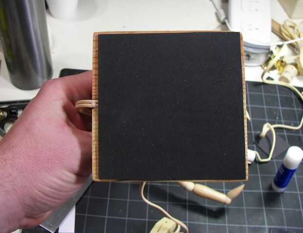 Por último, cortar algunos de eso hoja de la espuma de 2mm negro aproximadamente 3.75 "x 3.75". Pegar en la parte inferior de la base para cubrir el agujero y el cableado y el pegamento caliente y para dar la base de una almohadilla para descansar en el. En este punto, se hace la luz. Ahora es terminando el apoyo de iPad.