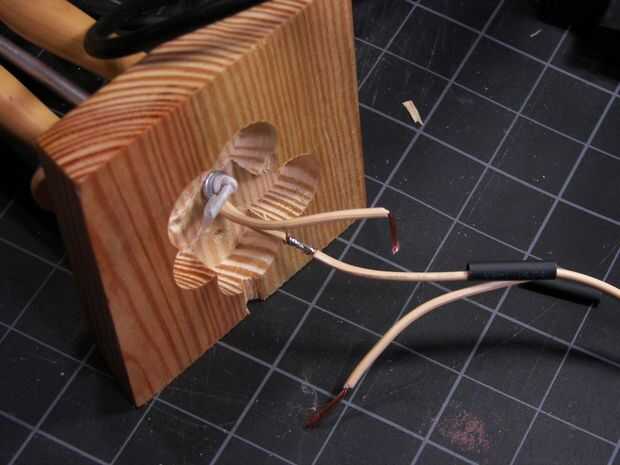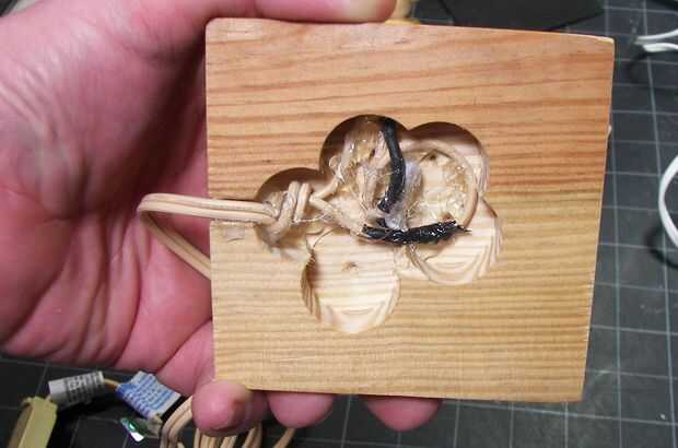 Un nudo en el cableado y poner eso al costado del canal que tallada en la parte inferior. En su momento, la inundación de la parte inferior con pegamento caliente para mantener todo en su lugar, asegurándose de que los cables no sobresalen por encima del área hogged fuera. Debe haber un montón de espacio.