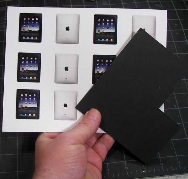 Hice una búsqueda en google en fotos iPad y encontrar un buen conjunto de frente y vuelta completo tamaño unos. Se trata de un iPad de primera generación para aquellos que se preocupan. I los redujo, duplicarlos y ponerlos en un archivo PDF para impresión. Ese archivo está incluido, y asegúrese de que imprimir en tamaño de 100%. Luego imprimí el archivo PDF en cartulina.