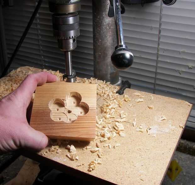 Ahora que ya tenemos la base en forma de y perforado, es tiempo para utilizar los pedacitos de forstner para cerdo algunos sala de trabajo en la parte inferior donde va el cable de conexión y elástico.