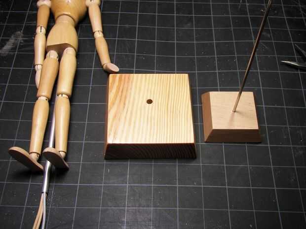 Perforé el 1/4 agujero ligeramente descentrado hacia la parte posterior. Centrado de un lado a otro, pero 2" del borde delantero de la parte superior. Así será el centro del maniquí sobre el centro de la base. He utilizado dos capas de laca, con un ligero lijado de grano 600 después de cada capa.