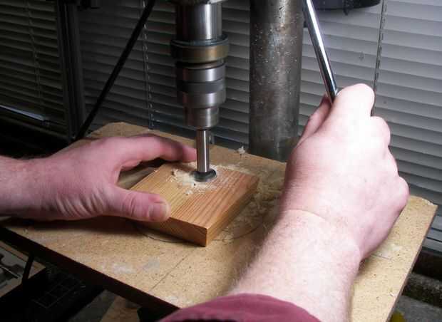 Estoy usando la 1" forstner bit, pero nada por ahí debería funcionar. Instale en su taladro y cerdo hacia fuera de la parte inferior de la base hacia el extremo posterior a una profundidad de 1/2". Esto le dará un montón de madera para el tubo de aluminio agarrar y un montón de espacio para cableado y todo eso. Hogged alrededor de un cuarto de la parte inferior, hacia la parte posterior de la base.