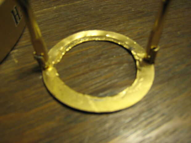 * Para montar el arpa utilicé un aro metálico para un socket de porcelana. Tengo que moler la abertura 1/8 de pulgada para conseguir que se ajuste. Era feo pero nunca se verá.