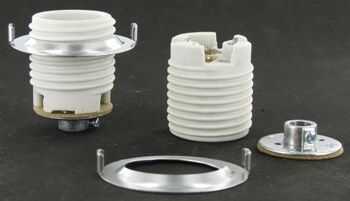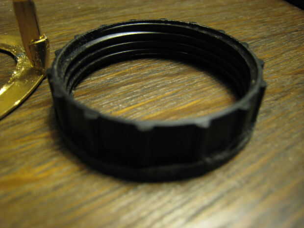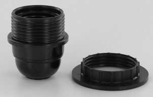 Para la conexión de la lámpara utilicé un zócalo fenólico de rosca con el hombro. He acabado lijado hacia abajo la mayor parte del borde del perno plástico por lo que encajaría entre el arpa.
