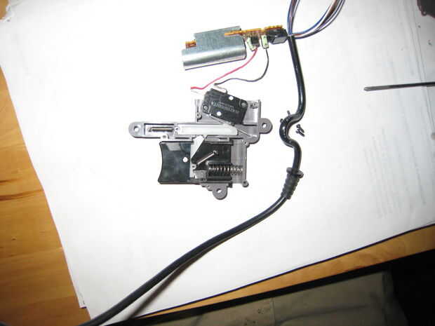 Y una vez que el gatillo gris cubierta abierta que tiene que quitar el interruptor sí mismo, todo lo demás. El interruptor será quitar todos los cables. Ten cuidado, algunas de las piezas son resorte y saltarán hacia fuera.