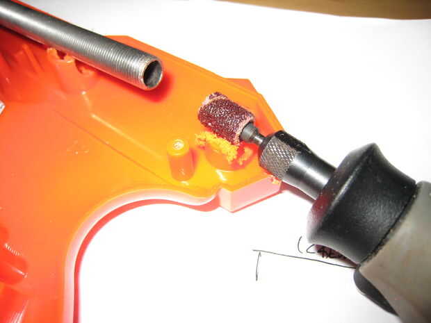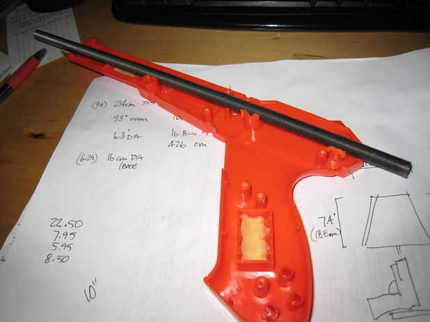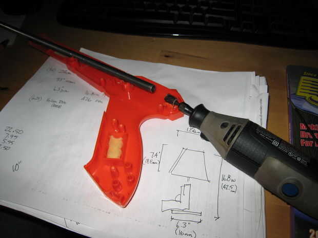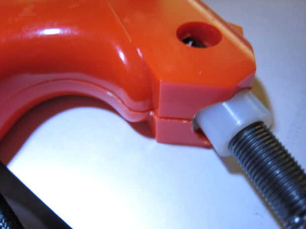 También necesita a un espaciador de plástico por la parte superior e inferior. Usted puede encontrar un cualquier tienda de mejoras para el hogar gran en los cajones de hardware especiales. El que está en la parte superior (1 pulgada de largo) sólo se encuentra entre un perno y el casquillo de la lámpara y sólo está destinado a cubrir la varilla roscada, por lo que no es vista (imagen en el paso 5). El inferior (1/2 pulgada de largo) se tope contra el perno delgado (mencionado abajo en la imagen 3) y cubrirá la barra pero también actúa como un espaciador para la parte de secundaria protector plástico de la pistola. Pero lo más importante es lo que van a quedar en la base y estará bajo la compresión de los tornillos de montaje de la base de la pistola.