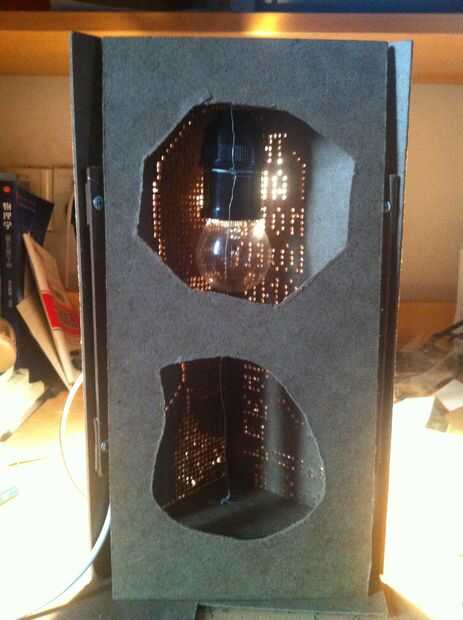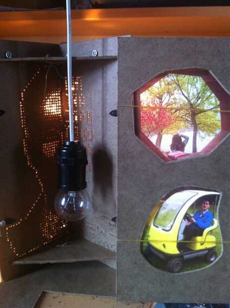 corté dos grandes agujeros en la pared posterior para colocar dos fotos. De esta manera, la lámpara estaba perfecta. Sus tableros de frente fueron mi retrato y un poema mientras que sus tableros traseros fueron dos de mi novia y mis fotos. Ensamble el tablero trasero. Hecho!