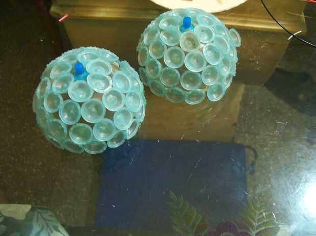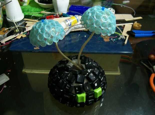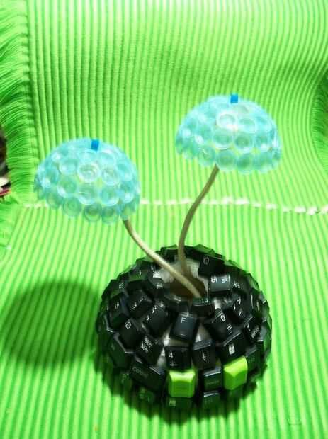 Toma tu objeto esférico translúcido, en mi caso la pelota de juguete, y dividela a la mitad. Comienza a pegar con la silicona caliente los contactos de goma del teclado, puedes ponerlos en el sentido quieras, con la "chupita" hacia afuera o hacia dentro. En mi caso, mi teclado tenía teclas multimedia con una forma cilíndrica, perfecta para ponerlas en la punta de la campana.