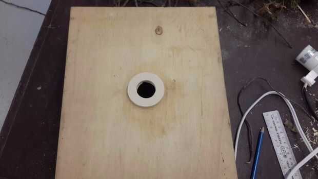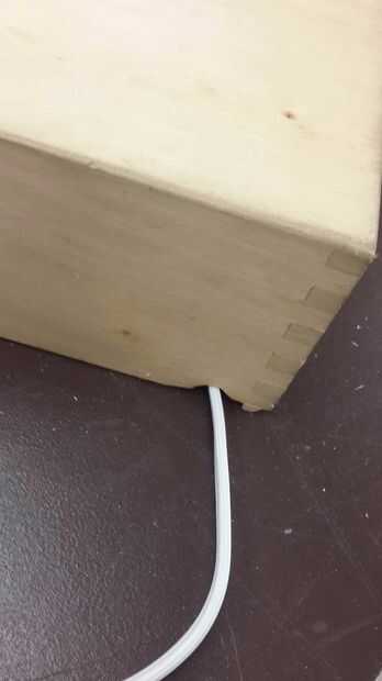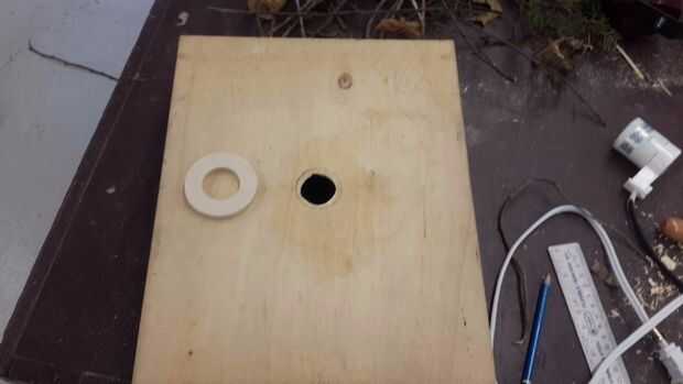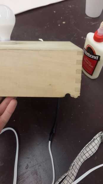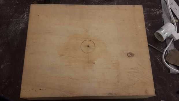 Tomar una caja de madera (encontró mi en la basura) y perfore un agujero en el centro lo suficientemente grande para el foco ir a través. Como alternativa, terminé tomando sólo un cincelado hacia fuera y luego lija suave. El agujero que hice es aproximadamente 1 y 1/2 pulgada de diámetro.
