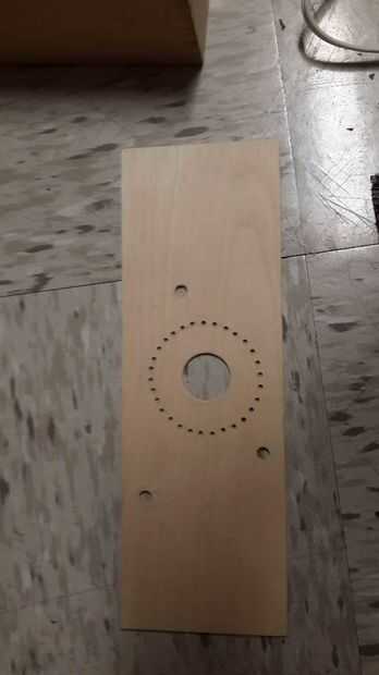 Luego, tomar un tablón de madera, 1/8 de pulgada o 1/4 pulgada de espesor y cortar hacia abajo para que el la longitud es igual a la longitud de la caja, y la anchura es aproximadamente de 4 a 5 pulgadas. Perfore un orificio de 1 y 1/4 de pulgada de diámetro en el centro de la tabla. Esto es donde el foco irá a través. Entonces, pueden perforar los agujeros en cualquier diseño que desee basado en donde desea que sus ramitas para ir. Decidí crear una jaula alrededor de la bombilla, por lo que perforé un anillo de pequeños orificios alrededor de la mitad. Luego perforé 3 más agujeros alrededor del anillo para pegar ramitas más grandes a través.
