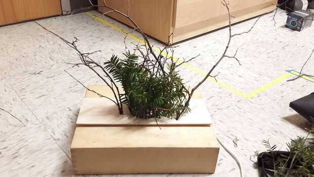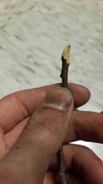 Ahora es tiempo de poner las ramitas. Puede que necesite tira hacia abajo los extremos de las ramitas para que encajen en los orificios que ha perforado. Yo simplemente despojado lo con mi uña, pero usted podría probablemente también utilice un cuchillo.