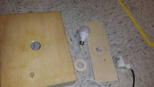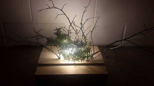 Ahora, tienes todo lo necesario para armar la lámpara: la caja, el anillo, el tablón, una bombilla y zócalo y un manojo de ramitas o ramas.